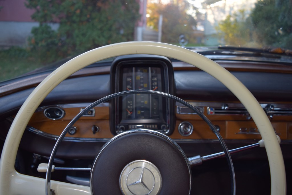 It scares the living crap out of me. It disillusions me, in fact, on the subject of vintage cars and their purported charms. It’s not just the entire lack of seatbelts, although the sensation of drifting along the seat when passing through a mild curve is disconcerting enough. I am, after my years of writing with vintage pens and cooking in vintage pots and wearing clothes that are at least reminiscent of vintage fashions, used to the idea of stewardship. The stuff I have is mine for but the current moment, to be handed on to future generations in as functional a state as I can manage (socks excluded– there’s some ephemera in every life).