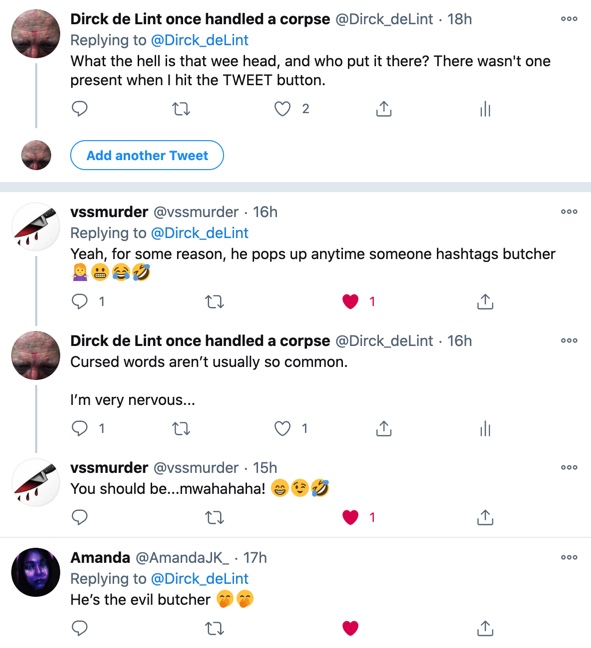 “#VSSMURDER Week Three” ©2020 Dirck de Lint, although I’m well aware that Twitter will do as it pleases with the content, since it appears on their platform, and there’s also some words I didn’t tweet which I make no claim to.